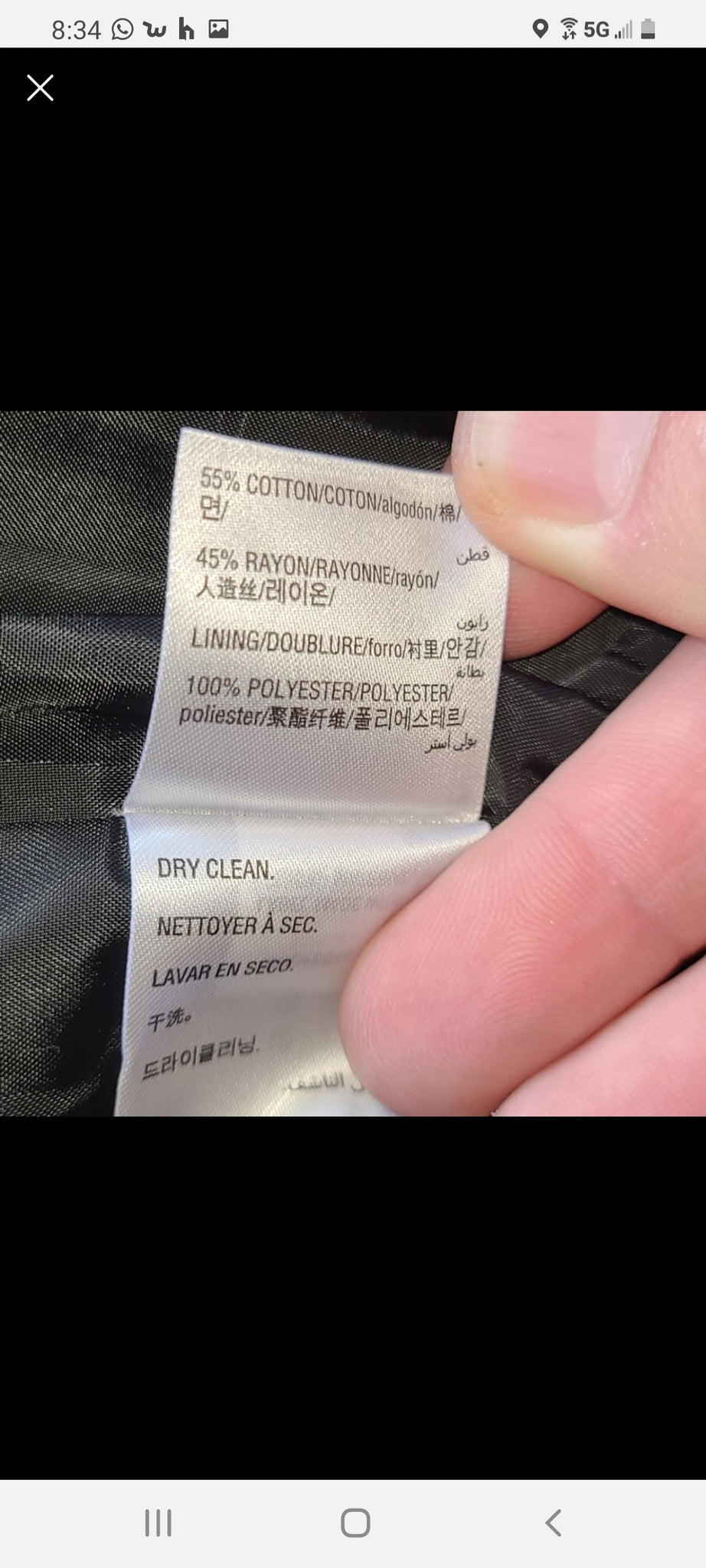 Made of a cotton and rayon blend, the shell has several pockets for all of your needs. The shell is soft, almost a velvet feel. The lining, made of polyester, has an inside chest pocket.